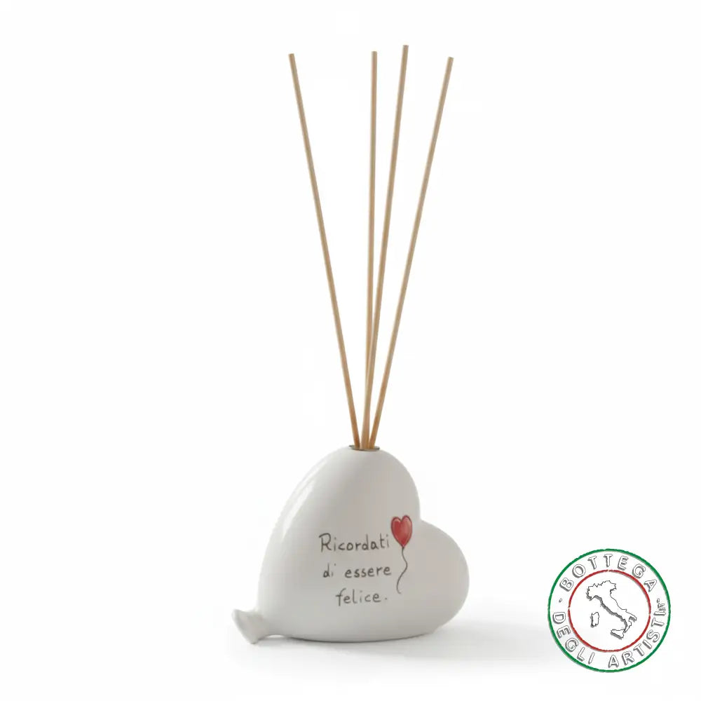 Questo profumatore a forma di palloncino cuore è un oggetto unico e originale, interamente fatto e decorato a mano nella nostra Bottega degli Artisti in Italia. Ogni pezzo è unico grazie alla lavorazione artigianale della ceramica e alla decorazione dipinta a mano.